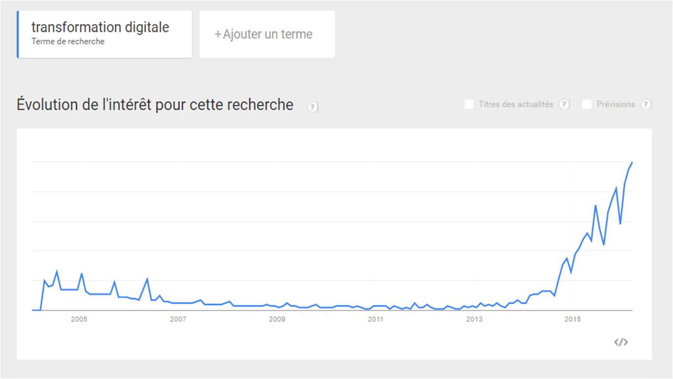 La transformation digitale est sûrement le buzz word de l’année. Au-delà du nombre de conférences ou d’articles qui en parle, un tour rapide sur Google trend confirme cette tendance entamée en 2015.